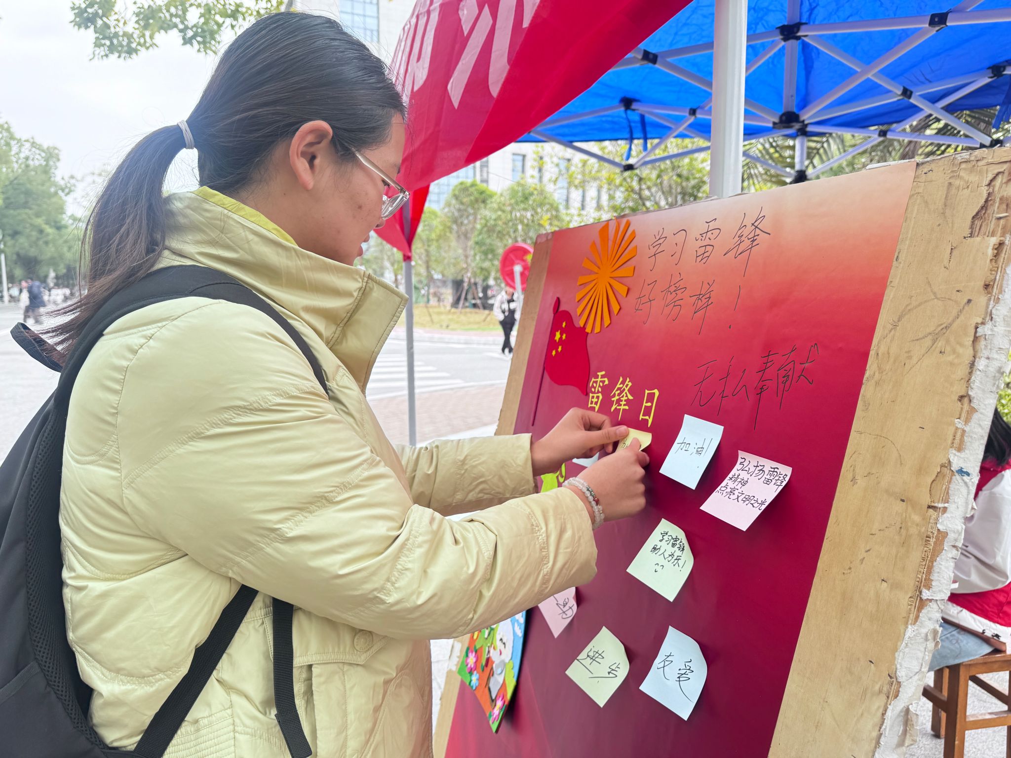 “弘扬雷锋精神,点亮文明之光”“学习雷锋,助人为乐”。同学们在纸上写下一条条动人的语句,裁剪一张张创意的贴画,纷纷贴在特制的红色雷锋记忆墙上,传递着青春的温度。