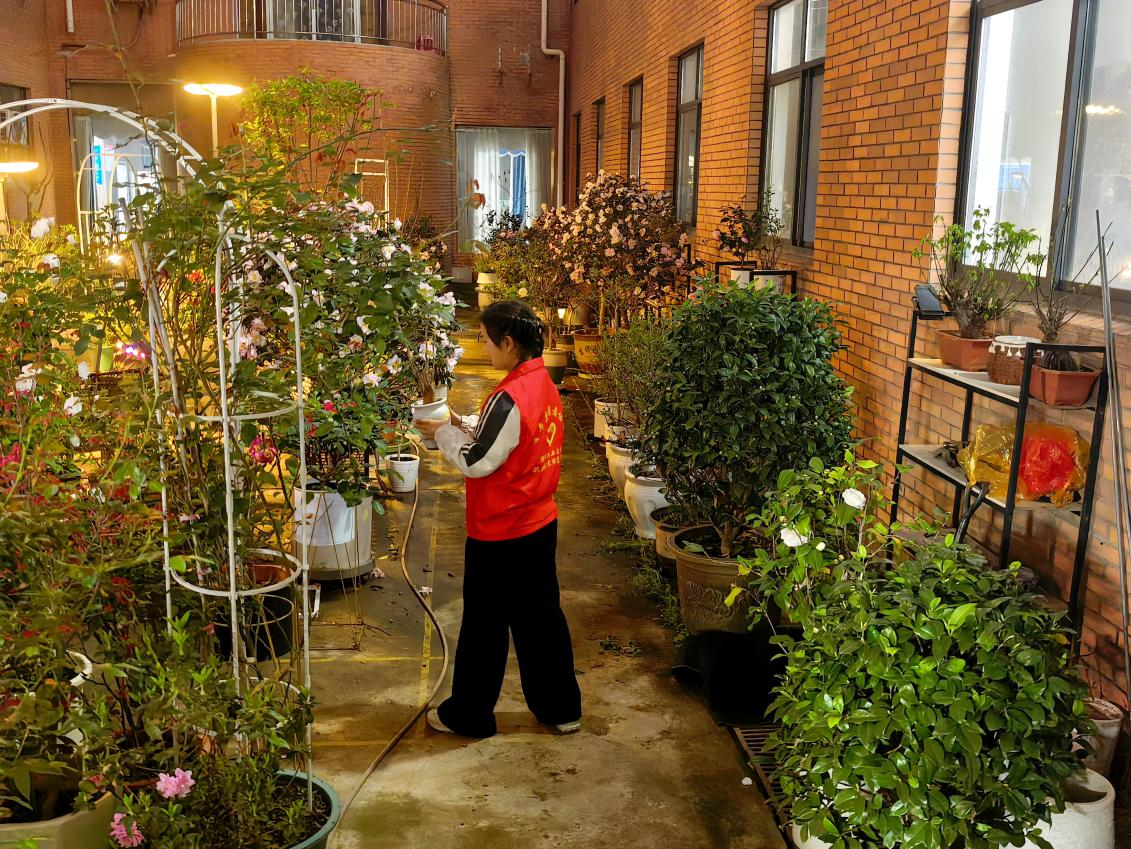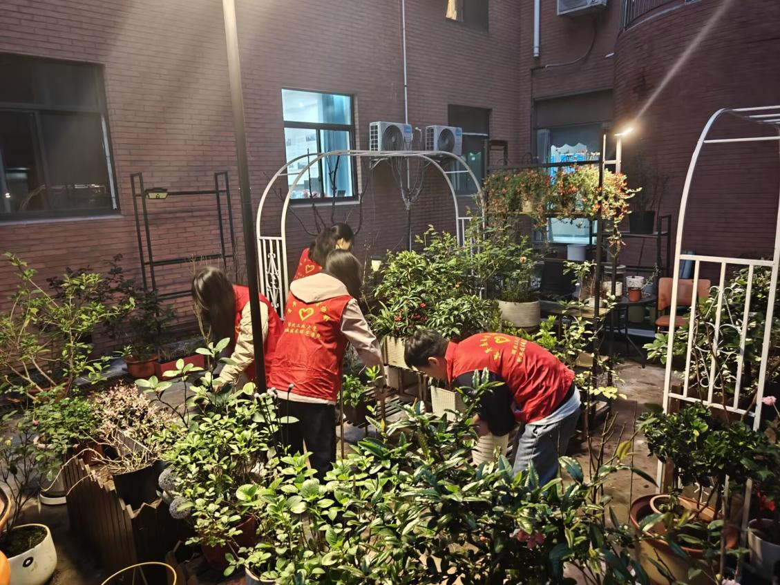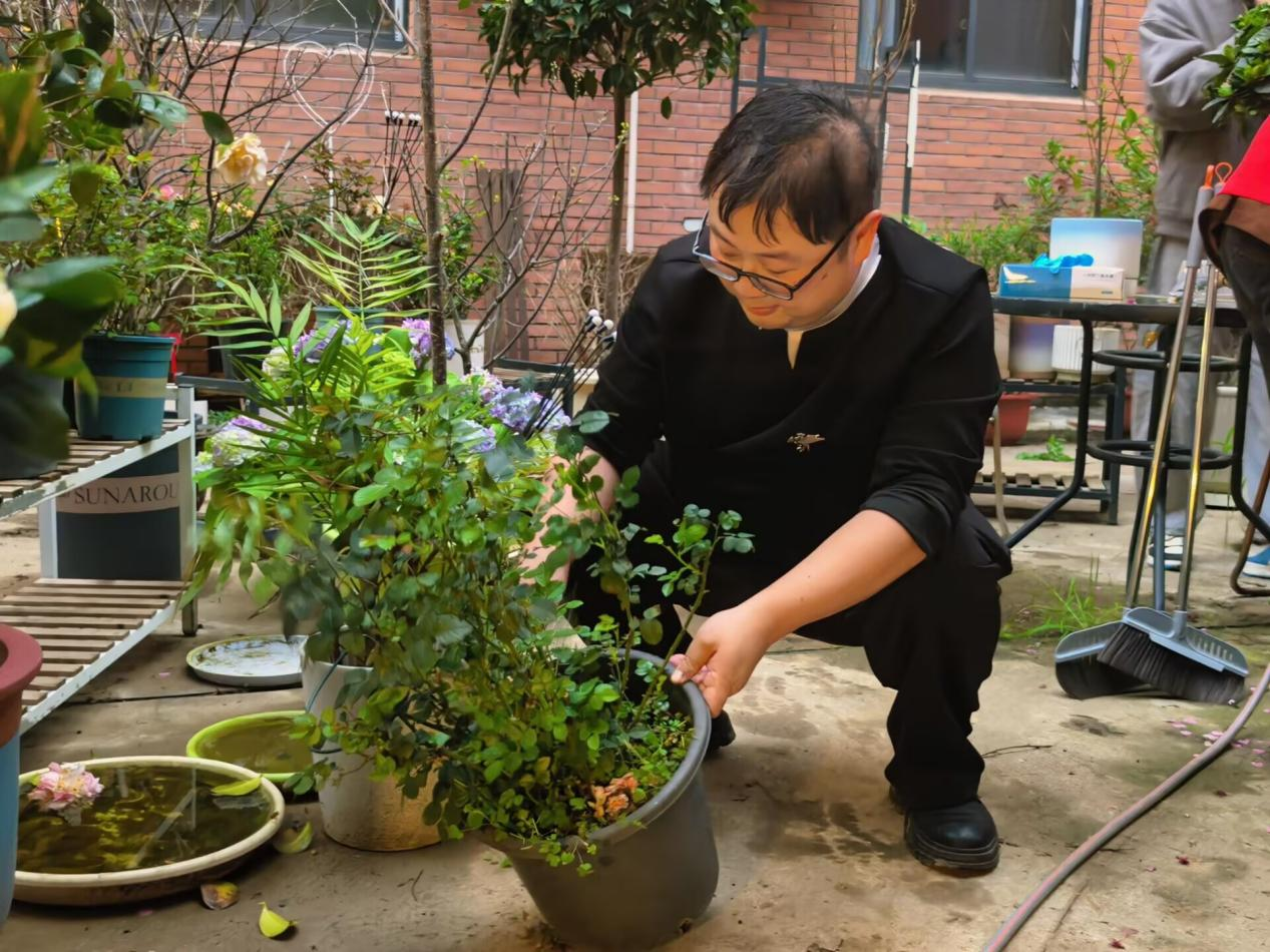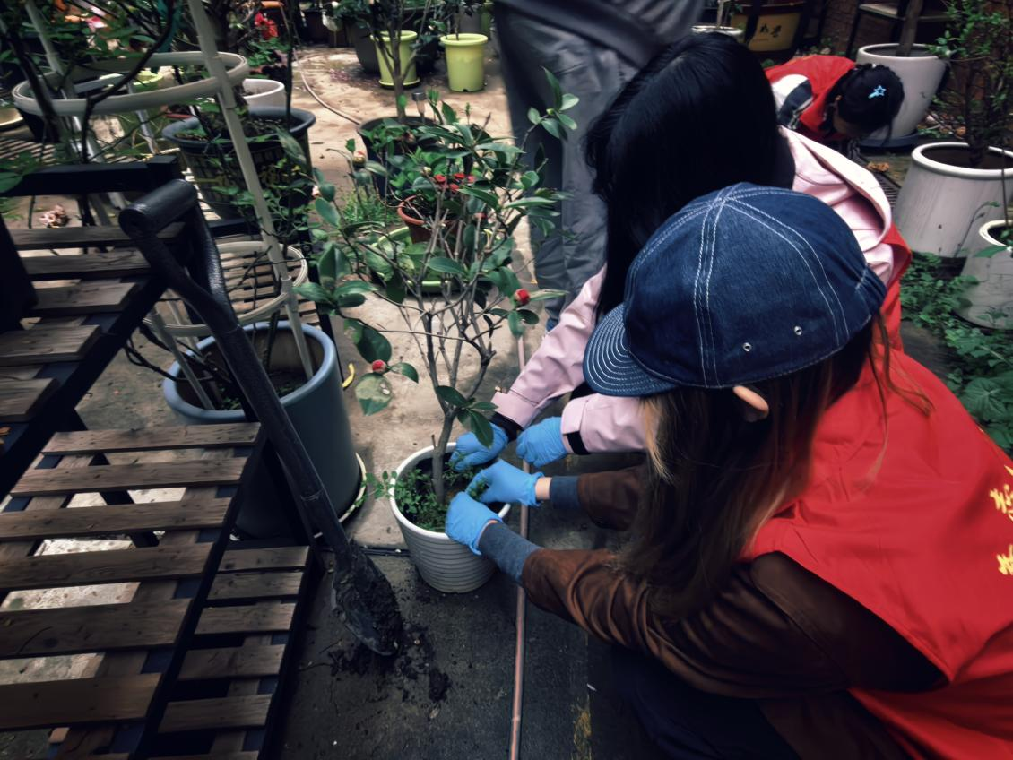 春意正浓,草木蔓发。活动现场,汪曦老师现场示范杂草与花苗的分辨技巧,细致讲解绿植养护要点,叮嘱要彻底清除争抢养分的杂草。在老师的指导下,同学们俯身入丛、分工协作。拔草、清扫、归拢、摆放,经过一个多小时的精耕细作,原本杂乱的角落焕然一新,盆栽和绿植错落摆放、相映成趣。看着自己付出的辛劳都化作了眼前的美好,大家眼里、心里充满了笑意。