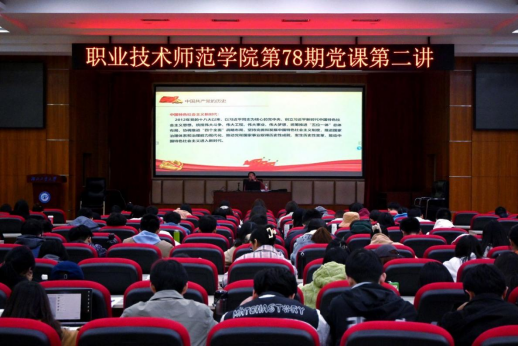 11月11日下午,职业技术师范学院第78期分党校培训班第二讲在博学堂授课,学院党委副书记章莹担任主讲人,学院全体学生党员、预备党员、发展对象、积极分子200余人参加了本次党课。