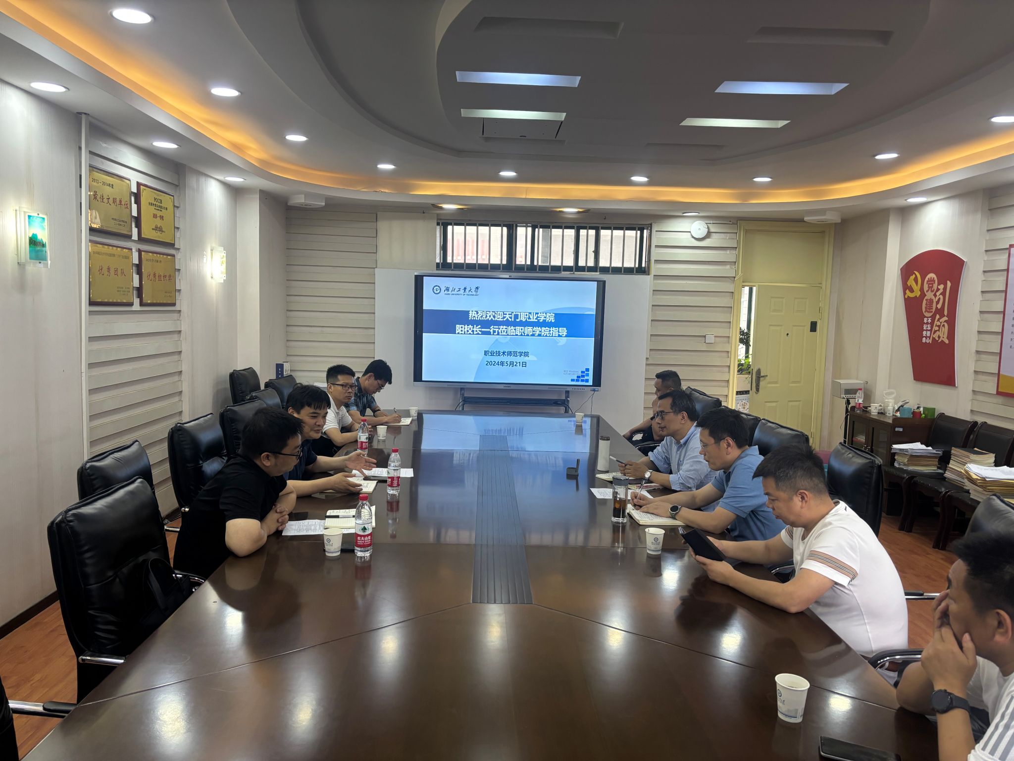 5月21日下午,天门职业学院党委委员、副校长阳军一行三人到我院,就5月9日签署的两校战略合作协议,开展有关天门职业学院“双高·双优”建设工作的合作交流。