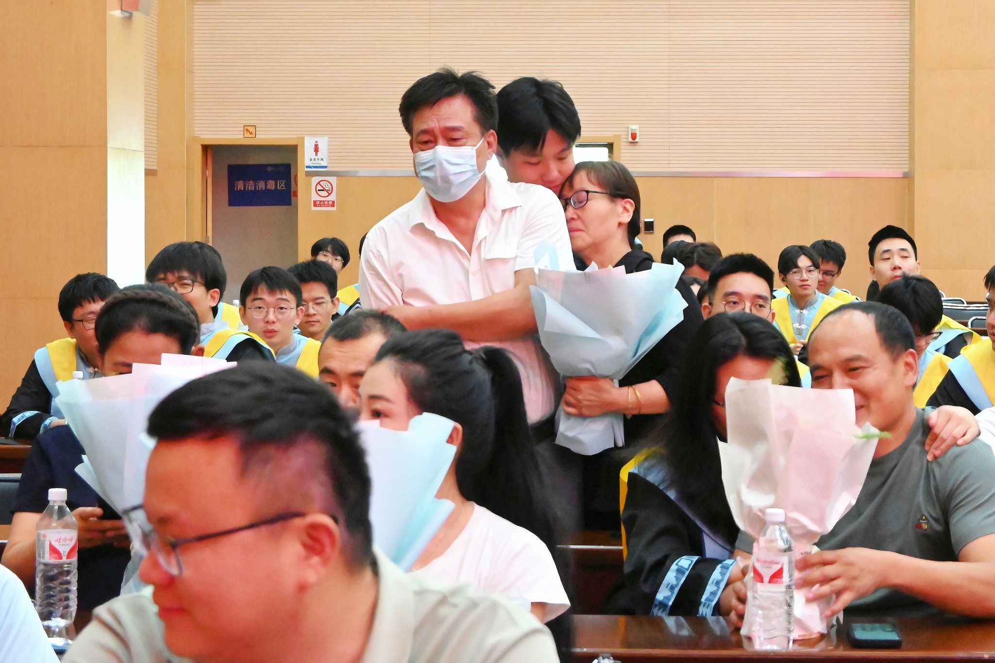 到场家长代表接受学生献花致谢。家长与学生或拍肩谈成长,或相拥念恩情……场面温馨、令人感动。