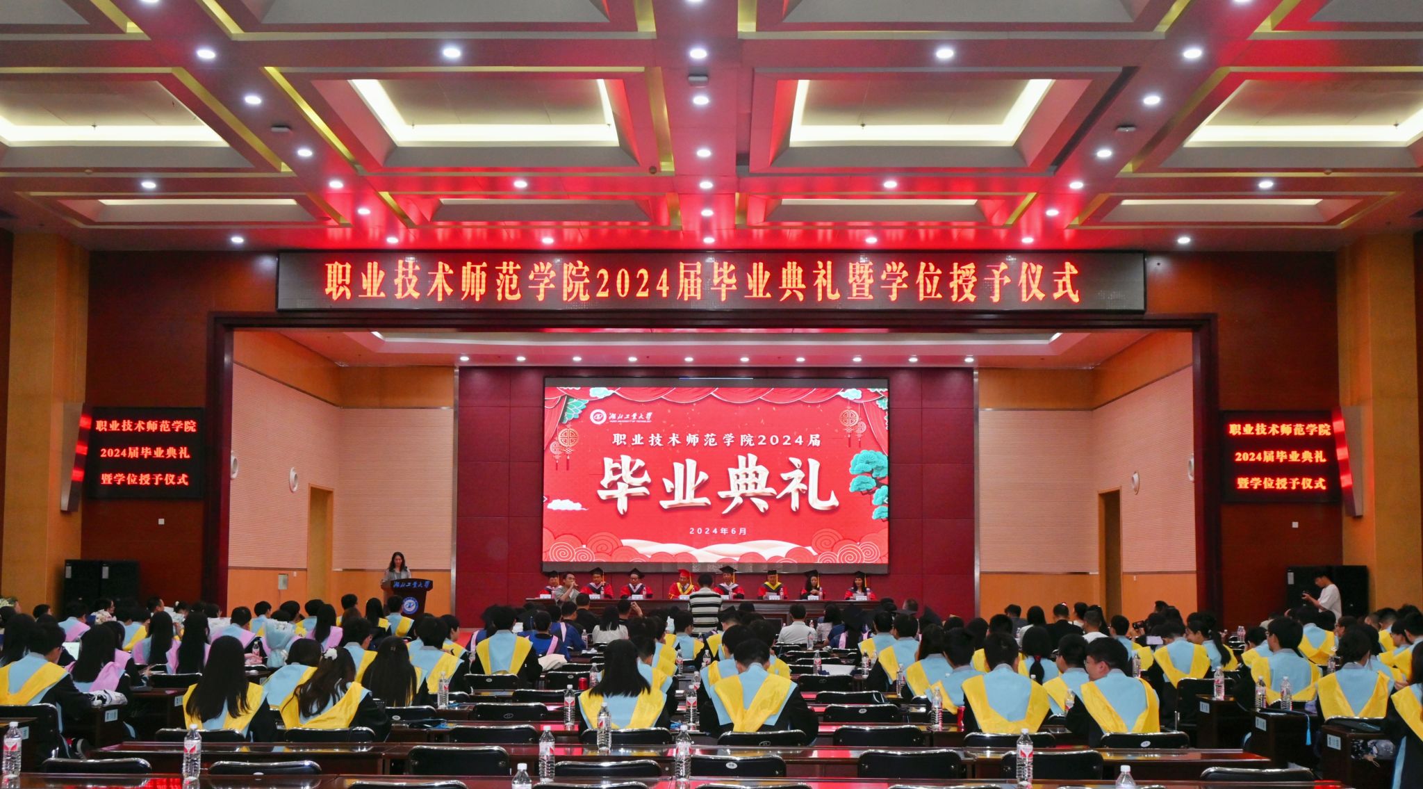 6月19日下午,职业技术师范学院2024届毕业典礼暨学位授予仪式在图书馆报告厅隆重举行。校党委常委、副校长王侃,职师学院全体领导班子成员、教授委员会成员出席典礼,职师学院全体教职工参与典礼,家长代表现场观礼。职师学院党委副书记章莹主持典礼。