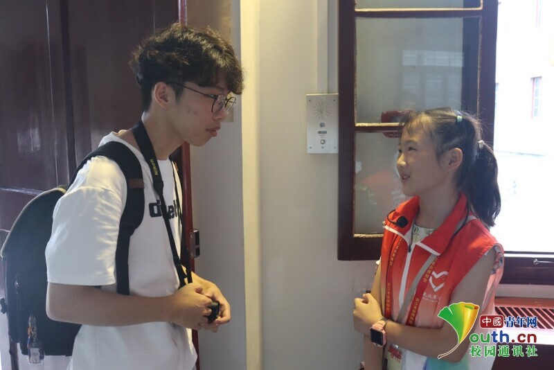 图为服务队成员采访在红色基地演讲的小朋友。 江淑雅 供图