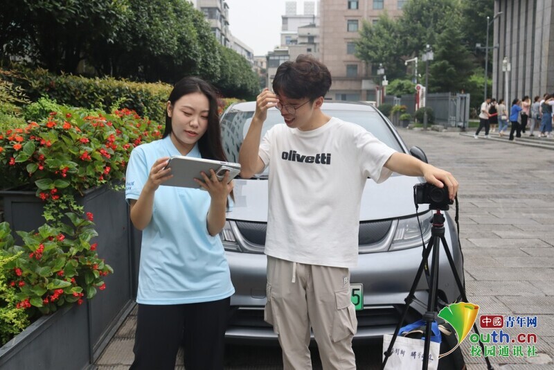 图为服务队成员确定拍摄走位。 江淑雅 供图