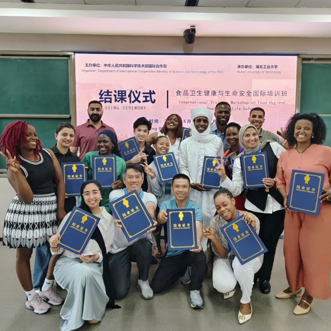 在结业仪式上,该校职业技术师范学院院长马丹、副院长宋庭新和生命科学与健康工程学院副院长代俊,为学员颁发了结业证书和纪念品。本次培训班的成功举办,促进了湖北工业大学与亚非国家的深入交流与合作,同时也是携手构建人类命运共同体的生动实践,为全球食品卫生与生命安全贡献了中国智慧与方案。