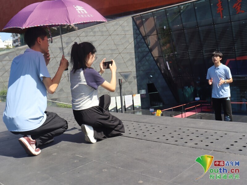 图为服务队成员确定拍摄走位。何煜伟 供图