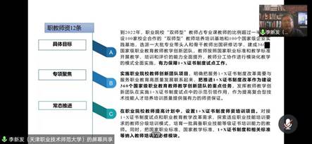 李新发教授以“聚焦1+X证书制度改革,加强双师型教师队伍建设”为题,首先从VUCA时代需求、科学技术快速迭代、职业技术教育的特点等方面进行分析,并指出了教育需求是从人才培养政策重定、资源重整、结构模式、平台重建、目标建立、课程重置、路径重定、方式重设等方面率先转型,结合国家政策文件以及个人研究成果,从推进1+X证书制度改革重点工作、职业教育教学改革的逻辑起点、双师型教师队伍建设政策部署以及职教师资队伍建设两个重点项目等四个方面为大家深入讲解如何高效推进1+X证书制度改革,如何进一步建设教师队伍。