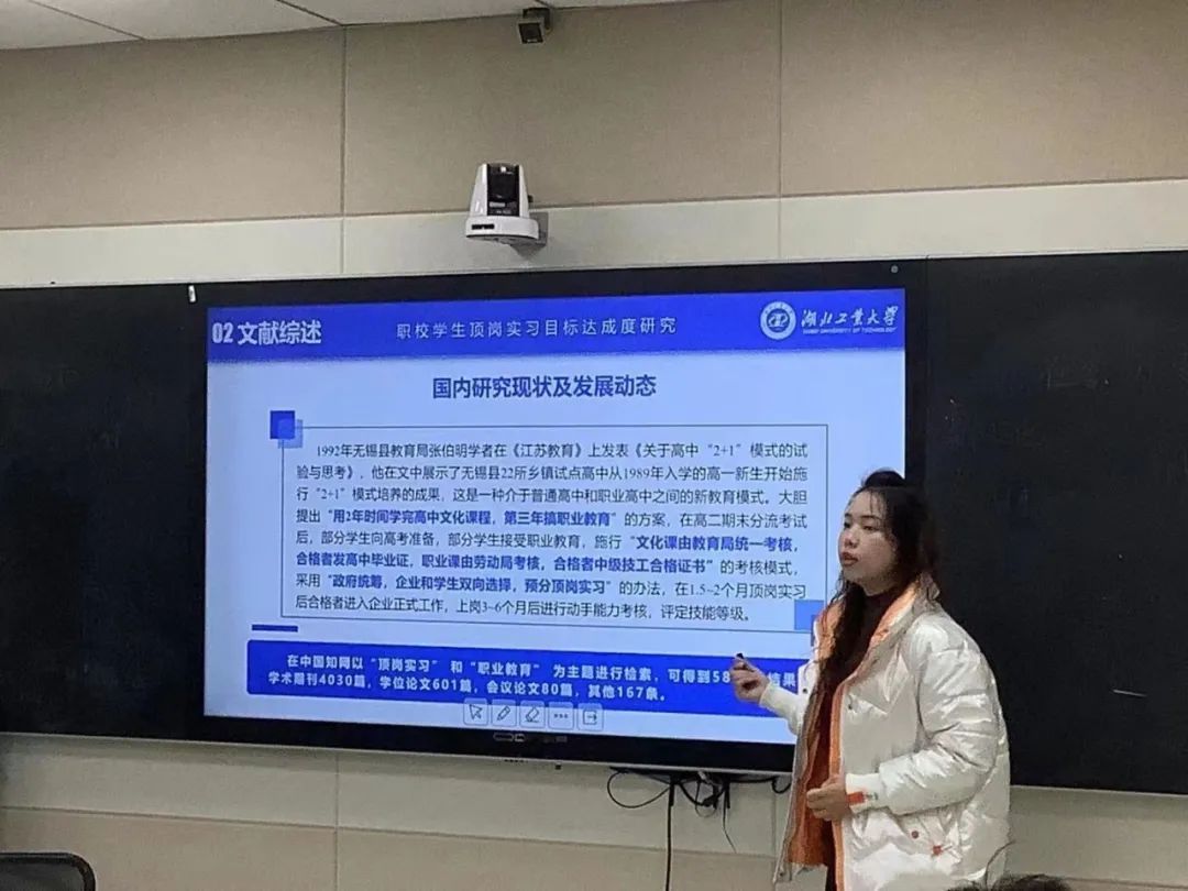 紧接着是梁高阳同学开题报告的分享——《职校学生顶岗实习目标达成度研究》,主要从立题依据、文献综述、研究内容方面做了具体阐述,与老师同学们交换了看法,对即将进行的研二开题答辩有一定的借鉴意义。