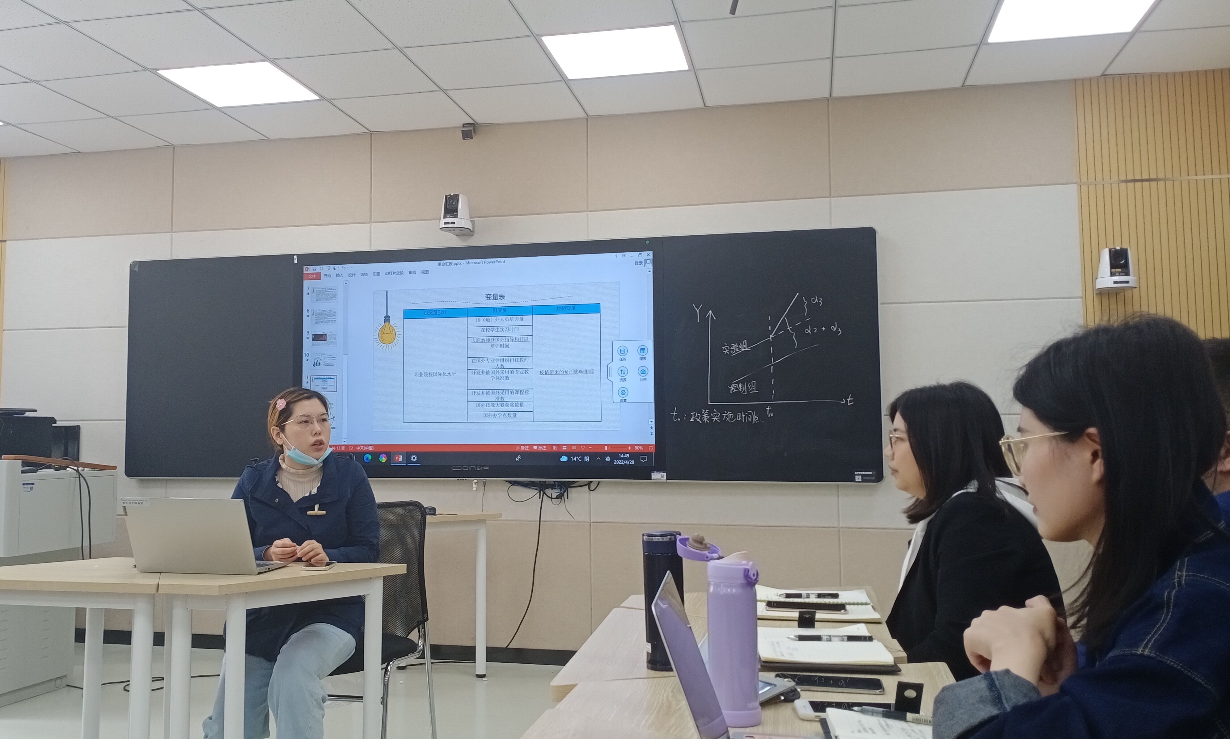 第二位是李雅萱同学分享的自己正在写作的论文《“双高计划”项目能提升高职院校国际水平吗?——基于双重差分法的研究》。李雅萱通过政策梳理、文献综述的方法进行理论假说并确立职业院校国际化水平的八个指标,并提出自己在写作过程中的困境,如数据还需要手动处理,以及还需要考虑疫情因素对国际化评价的影响等。各位老师对李雅萱同学的选题予以肯定,同时也提出了建议。马丹教授考虑到国际化水平是一个长期性的考察标准,对其数据和指标的选择进行提问,指出其指标选择存在相应问题;向蓉老师对其数据处理进行补充,建议李雅萱同学附以“倾向得分匹配法”(PSM)以解决数据内生性和选择性偏差的问题;杨秋月老师则关注其研究目的和研究结论,建议其聚焦在政策建议和学校人才培养上。李雅萱同学在老师们的提问和高效交流中逐渐厘清了写作思路,获益良多。
