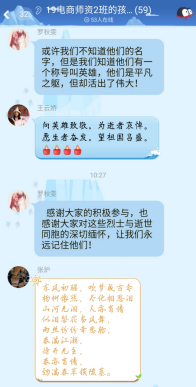 4月4日上午10点,随着各地防空警报鸣响,各班团支书在班级群中组织全体学生集体默哀3分钟。随后,各团支部纷纷开展线上悼念活动。有的团支部开展线上讨论,分享感悟,表达对烈士和逝世同胞的祈愿;有的团支部组织同学们创作诗歌,用纸笔书写哀思,缅怀同胞。在年级群、班级群中,同学们自发点上一支支蜡烛,悼念逝者。还有的同学们在空间或朋友圈分享哀悼之情。学院青年志愿者协会组织各班开展了网上祭奠英烈活动,大家通过中华英烈网、人民网云端向烈士献花,重温英雄事迹,缅怀致敬英烈。学院微信公众号分享了人民网“清明祭:因为,怀念”在线献花活动,组织同学们通过科学、文明的方式为英烈、亲友遥寄哀思。