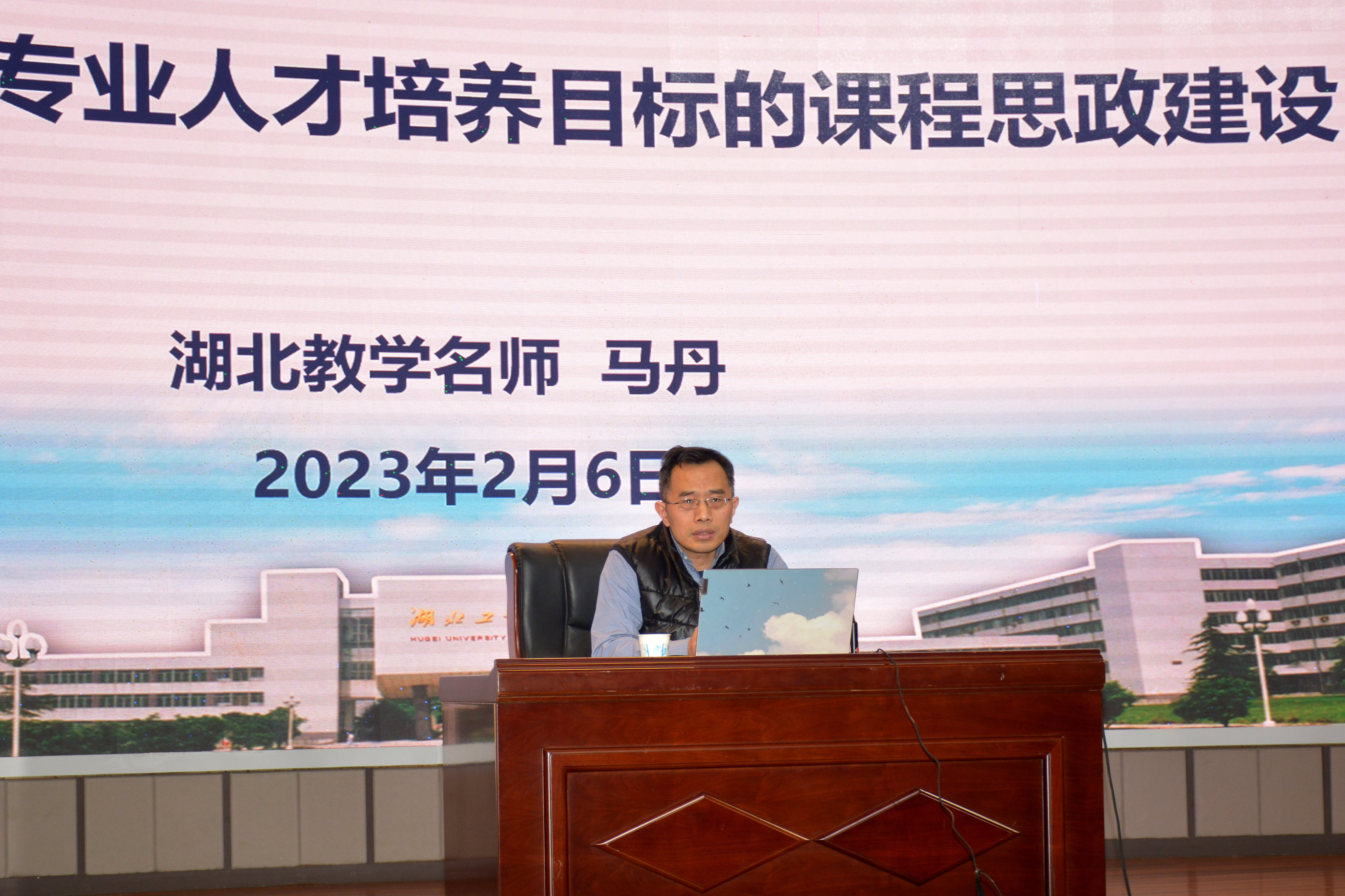 如何梳理、挖掘本课程思政元素?如何立足专业,将专业知识体系教育、技术技能培养和思想政治教育融通,融入专业人才培养全过程?2月6日下午,仙桃职业学院举办课程思政建设研讨交流会,邀请我院名师工作室首席专家、湖北省课程思政教学名师马丹教授作课程思政建设专题讲座,进一步推动学院课程思政建设。仙桃职业学院院长李立勇出席讲座。副院长徐国洪主持。各二级学院分管教学副院长、课程建设负责人、教师代表参加。