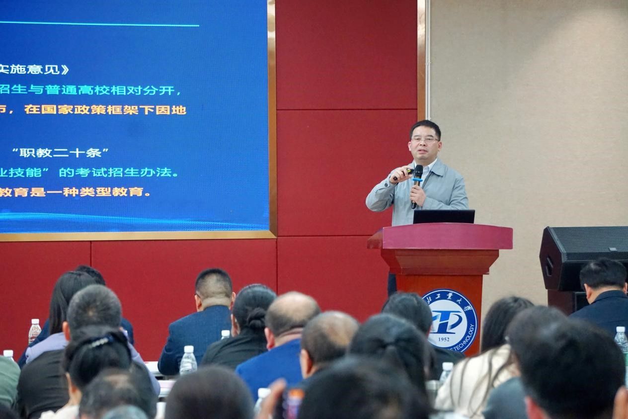 首先,湖北省技能高考专家委员会秘书长、武汉船舶职业技术学院电气与电子工程学院院长吕金华作《技能高考辅导报告》。吕院长指出,湖北省自2011年开始分类考试改革试点,首创“技能高考”新概念,划分10个考试大类。技能高考规模不断扩大,每年有10余万考生通过技能高考进入大学深造。技能高考的实践推动了湖北省乃至全国职业教育的改革和创新。
