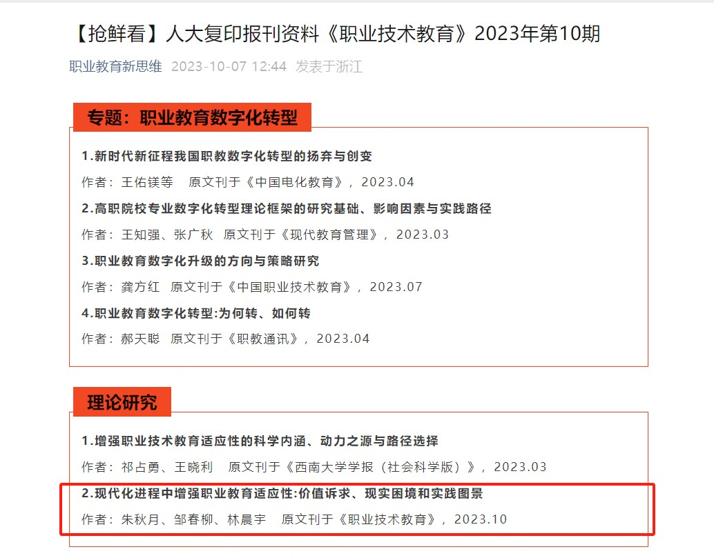 《人大复印报刊资料》由中国人民大学书报资料中心出版发行,是我国社会科学领域公认的国家级权威性刊物,已成为评价人文社会科学期刊学术影响和人文社会科学研究成果水平的重要参考依据之一。朱秋月副教授的论文被《人大复印报刊资料》全文转载,既是名师工作室重视学科建设和学术研究的结果,也彰显出工作室教师在职业教育领域的活跃度。这必将对名师工作室教师高水平论文撰写发表起示范作用,也将对工作室职业教育的科研工作产生激励引领作用。