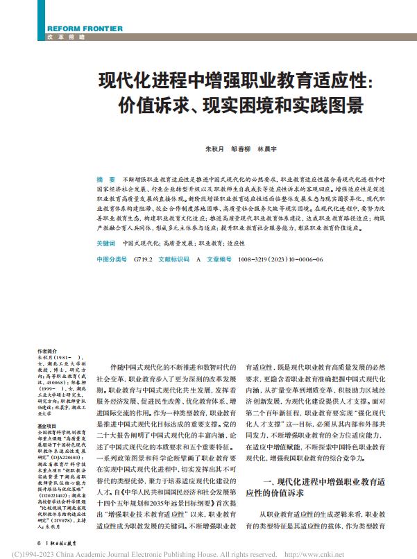 近日,湖北教育学名师工作室朱秋月副教授为第一作者的论文《现代化进程中增强职业教育适应性:价值诉求、现实困境和实践图景》被中国人民大学复印报刊资料《职业技术教育》(2023年第10期)全文转载。该论文原发表于中文核心期刊《职业技术教育》(2023年第10期),系全国教育科学规划教育部重点课题“高质量发展驱动下中国特色现代职教体系适应性发展研究”(DJA220480)的阶段性研究成果。