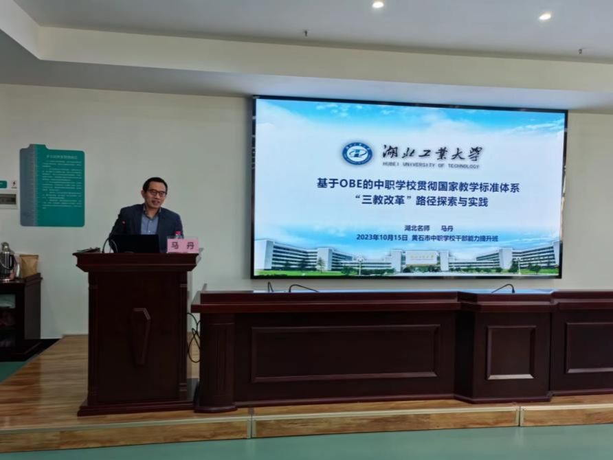 湖北省马丹“教育学”名师工作室自成立以来,积极为省内各地市、各职业院校开展社会服务,为地方职业院校发展献言献策,积极助推职业院校教育教学创新和人才培养转型升级。湖北名师、湖北工业大学职业技术师范学院院长马丹教授受黄石市教育局邀请,于2023年10月15日为黄石市10余所中职学校开展了题为“基于OBE的中职学校贯彻国家教学标准体系 暨三教改革路径探索与实践”的专题讲座。