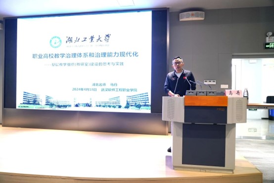 2024年4月18日下午,湖北教育学名师工作室首席专家马丹教授受邀赴武汉软件工程职业学校作“职业高校教学治理体系和治理能力现代化——基层教学组织(教研室)建设的思考与实践”专题培训。此次培训会在学术楼三号报告厅开展,武软各学院教学工作负责人、教研室主任、高职教务处及各学院教务科全体人员参训。